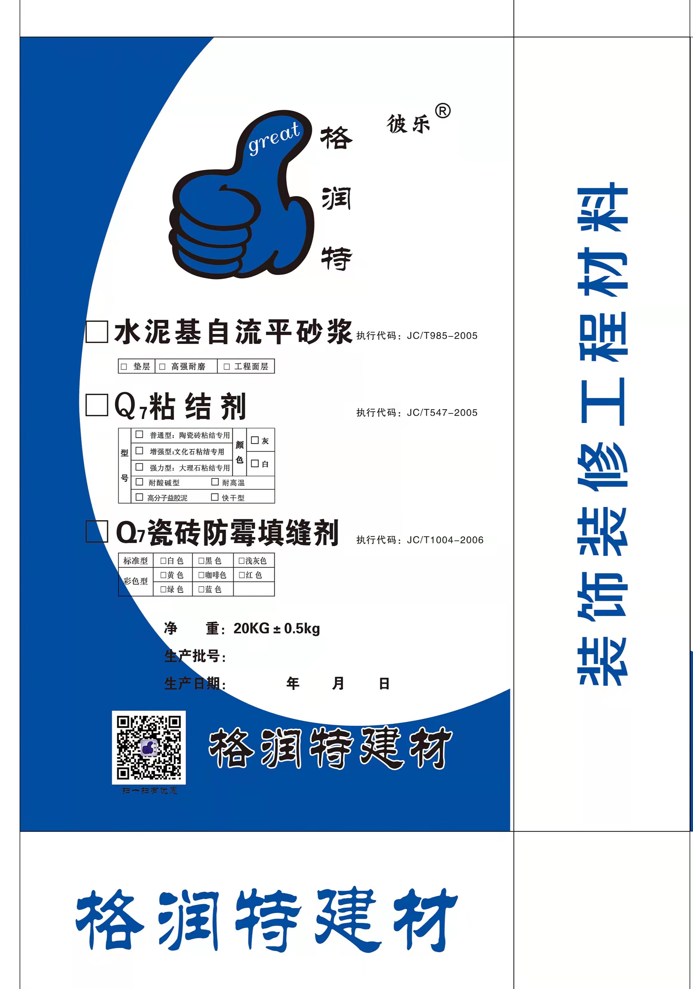 外觀: 自由粉體狀   色澤: 灰色、綠色、紅色或其它顏色等   粘結(jié)料: 普硅水泥、高鋁水泥、硅酸鹽水泥等   附加劑: 多種表面活性助劑及分散乳膠粉   水料比: 5/25kg     室內(nèi)民用自流平   干基密度: 1.5公斤/